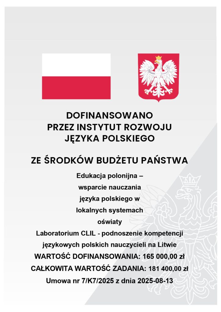 Projekt ma na celu trwały wzrost efektywności nauczania przedmiotów szkolnych w języku polskim oraz zwiększenie liczby godzin kontaktu uczniów szkół polskich na Litwie z polszczyzną fachową w polskich gimnazjach.